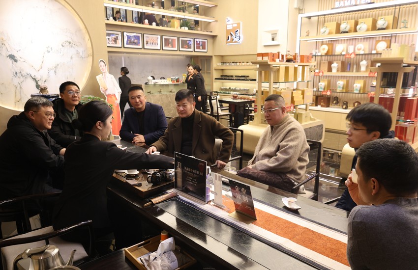 在随后的座谈交流环节,双方围绕行业发展趋势、企业经营管理、资源整合对接等议题展开深入探讨。门店负责人首先全面介绍了八马茶业的发展历程、全产业链布局及门店的经营现状,分享了在当前市场环境下,企业依托品牌优势、产品创新与服务升级实现稳健发展的经验做法,并就茶产业与其他行业的融合发展、客户资源共享等方面提出了合作设想。